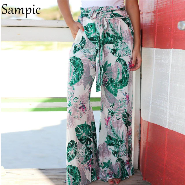 Sampic — Pantalon taille haute et jambe évasée, style bohème, pour femme, bas long, large et décontracté pour la plage, imprimé fleuri, ceintures roses, été